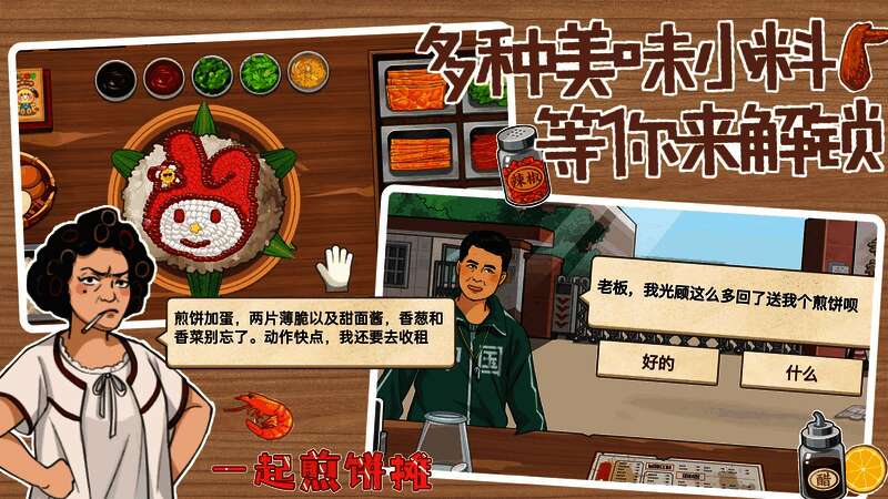 1. 煎饼制作:玩家要根据顾客订单挑选食材,快速制作出符合顾客口感要求的美味煎饼。