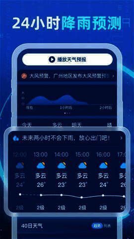 2. 天气状况可精确到一小时,涵盖阴天和温度变化。