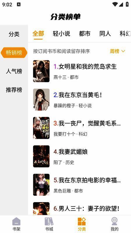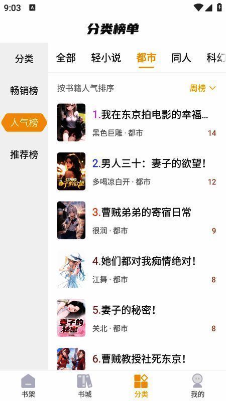 3、“分类”栏目对小说进行详细分类,如都市、同人、科幻等。