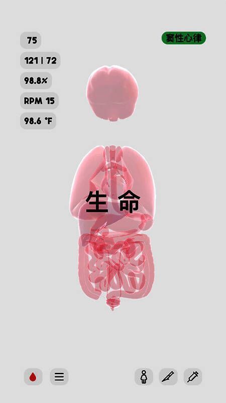 生命人体模拟器是一款极具严谨性的生理科普类游戏,创意十足。玩家能以经验丰富医生的视角,探索互动式的人体构成。游戏会以3D透视图展示人体主要器官,玩家创建好人体模型后,其会自动进行生命活动,不可避免会出现意外情况,这些异常状态会显示在游戏右上角,玩家可像医师一样操作处理,如注射药物、急救、手术、喂食等。