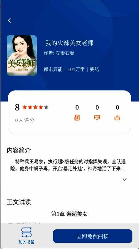 5、点开想看的小说进入详情页,点击“立即免费阅读”。