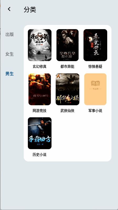 2、“书城”页面小说分类详细,各类小说一应俱全。