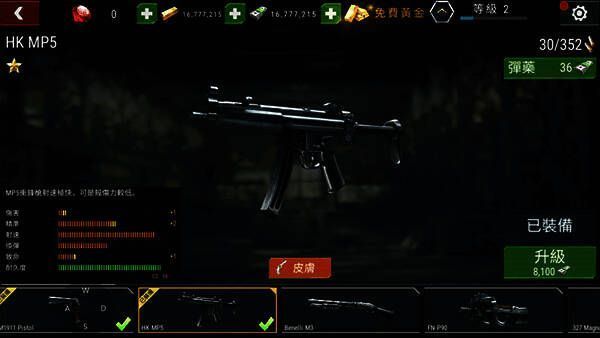 需要通过升级解锁更强力的枪支,并且使用黄金购买后才能使用。游戏开始会赠送一把初始的手枪和冲锋枪,可使用游戏现金进行升级,升级次数受玩家等级影响。当无法购买后续枪支时,升级已有枪支是不错的选择。