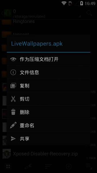 长按文件夹可调出菜单,进行压缩、复制、剪切等一系列设置操作。