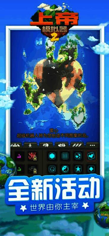 若加入多彩像素艺术风格,玩家将体验到前所未有的游戏乐趣。游戏操作简单,玩家用上帝之力创造世界,用超级元素和道具打造如中国世界地图般的美景。