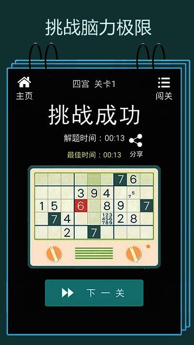 3、闯关模式:游戏设置了多个不同难度的关卡,玩家从初级起步,逐步挑战更高难度的数独题目,进而解锁新关卡。
