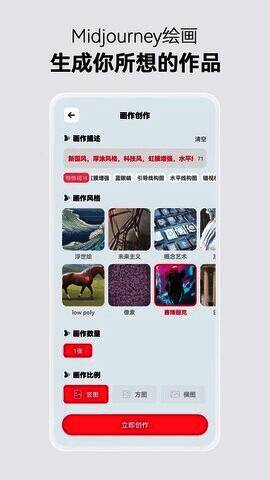 midjourney中文免费版APP下载后即可免费使用,能轻松完成各类绘画创作。它带有AI对话功能,输入简短关键词就能出图,还支持上传底图生成图片,可生成二维漫画、卡通人物、宠物、老外等景观和人物图像,满足多样创意需求。用户能选择不同风格,一键创作各种作品。