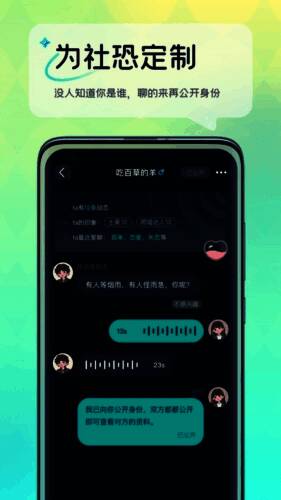 4. 针对社交焦虑定制,匿名聊天开启,对话成功后身份公开。