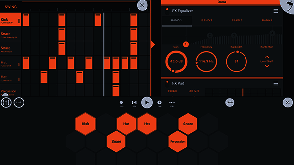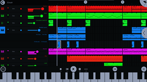5. 键盘/鼓垫:FL Studio提供极具创新性的键盘,可堆叠、大小可调,支持5次同时触摸,键盘大小和滚动手势可调节,有3键标签模式、一键记录撤销功能,还能执行循环记录并配置为节拍器。