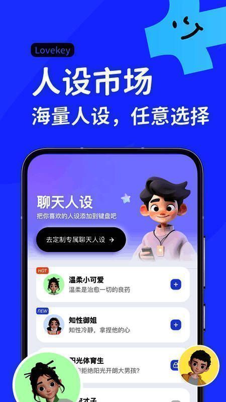 lovekey键盘官网版是专业的聊天键盘软件。用户能通过软件创建个人设置,如展示高情商或温柔浪漫等特征,以更好应对各种聊天场景。