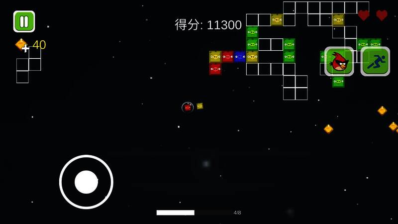 4、屏幕右上角显示玩家血量,每次碰到方块会损失一颗心,操作需谨慎。