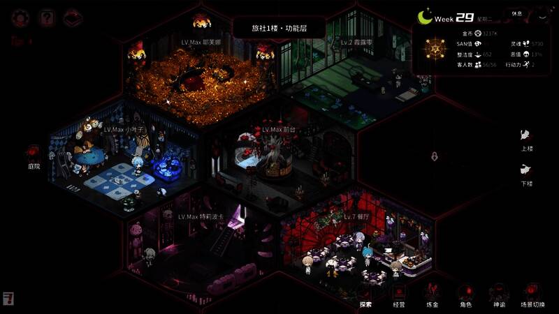 游戏艺术设计出色,运营策略性强,通过温和的克苏鲁设定带来独特的恋爱管理体验。玩家可通过经营酒店打开商业区,解锁更多内容,加速还债。不同种族的攻略角色增添了游戏推广动力。