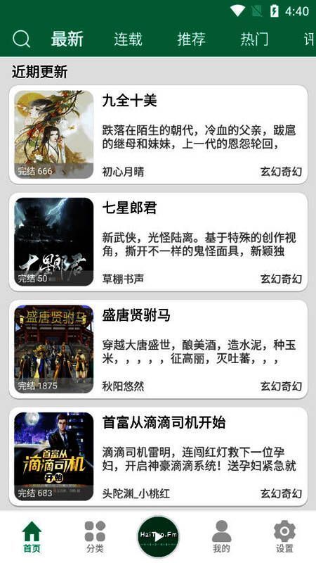 海豚之音是一个资源丰富的小说平台,其有声读物涵盖多种类型,像武侠小说、言情小说、历史穿越、恐怖悬疑、游戏竞技、军事纪实、相声评书、百家讲坛等。该软件无任何广告,能让用户获得身临其境的阅读体验。