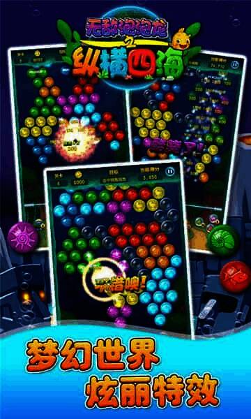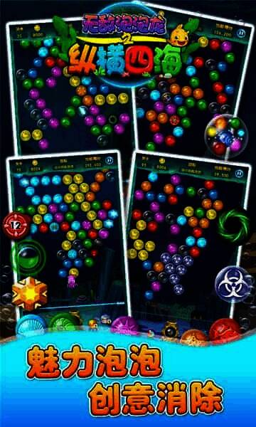 《无敌泡泡龙之纵横四海》是一款经典的泡泡龙消除休闲游戏。玩家发射彩色泡泡,将相同颜色的泡泡凑成三颗或以上进行消除,目标是清除屏幕上所有泡泡,防止其堆积到危险位置。