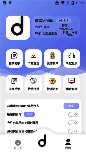 1、下载并打开魔音Morin,点击“我的”,里面有显示桌面歌词的选项