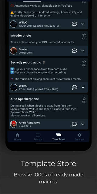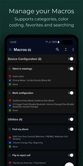 智能触发器是一款操作简便的任务自动化配置应用,其界面简洁,配置过程直观易懂。用户可列出宏,查看宏的数量和详细信息,还能进行删除、复制等编辑操作。添加宏时,有已列好的开关操作可供选择,也能利用新手宏预览模板自定义创建宏,并且支持导出导入到本地存储或通过安卓分享。