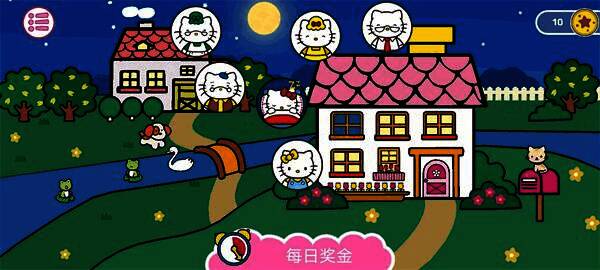 1、梦境画面:采用温馨可爱的卡通风格,以Hello Kitty为主角,营造充满童趣梦幻的睡前世界,让玩家放松身心。