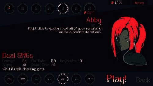 - 夏娜(初始人物):HP为4,每次升级有一次重置可选择技能的机会。技能有快速学习(经验获取+40%)、专家(下一个升级能力获3倍效果)、飞升(升级选项出现3个光环碎片,集齐合成光环)、光环(射速+50%,换弹速度+50%,可视范围+75%)。