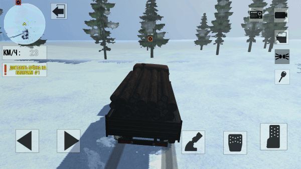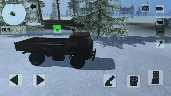 下载安装好游戏后,点击第一个选项进入游戏。这里所有车辆已解锁,玩家可随意选一辆进入。在冰天雪地的环境中,轻松操作驾驶完成任务。找到绿色圈图标,这是任务起始点,将车开到此处,装载一车木头后,朝着橙色图标指示的方向前进即可。