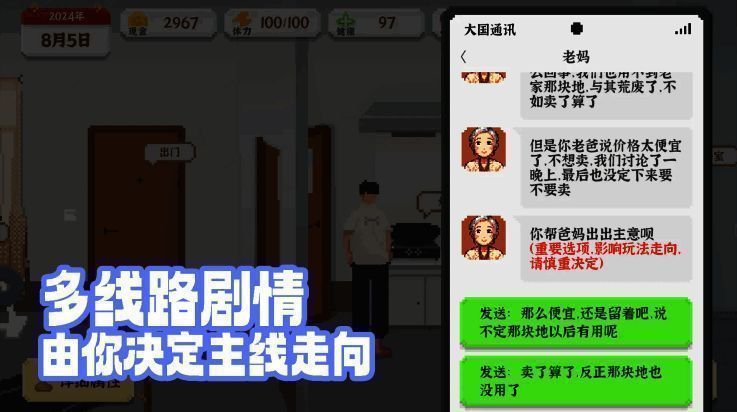 - 游戏中有各种随机事件,像经营农场时农产品价格浮动,走在工地有人抛来入职邀请,带来多样体验。
