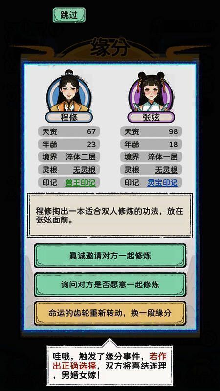 《修仙世家模拟器》免广告安装入口所对应的游戏是一款注重文本修炼的奇幻游戏。在修仙世界中管理自己的家族,家族成员不断成长,具有很高的开放性和体验价值。你可以加入门派,学习秘籍,促成转世婚姻。家族新老成员不断变化,外出历练获取经验,感受家族带来的无与伦比的自豪感。