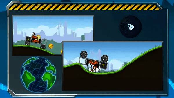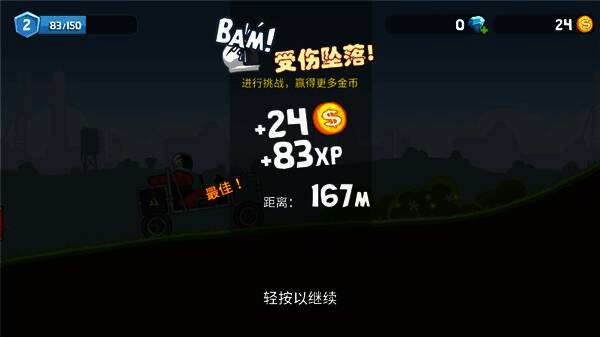4、游戏操作简便,玩法类似登山赛车,若车头翘起玩家就按住刹车。