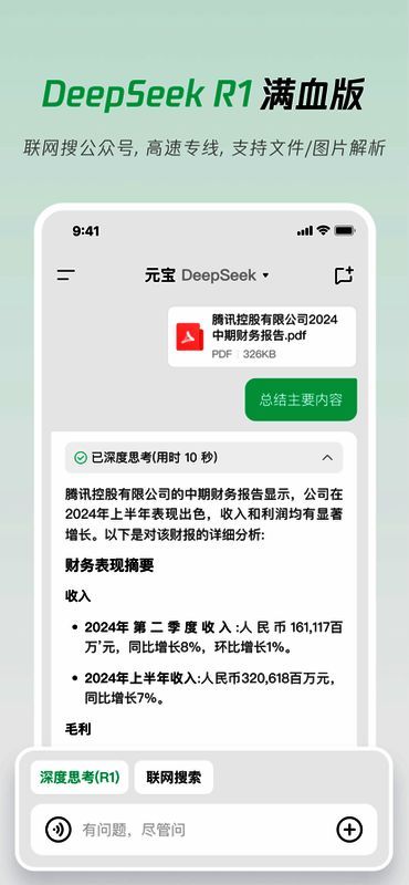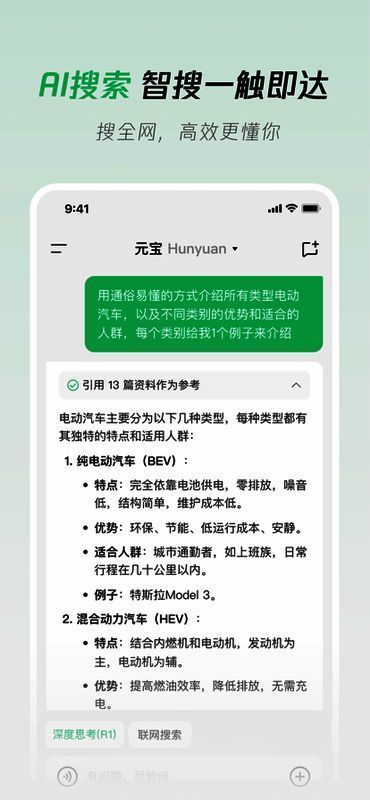 腾讯元宝凭借强大的模型和搜索功能,能为用户提供精准答案。无论是搜索答案、资料,还是寻找灵感,都能实现一问即达,让信息搜索变得更加轻松惬意。软件功能丰富多样,有需求的用户赶快下载体验吧。