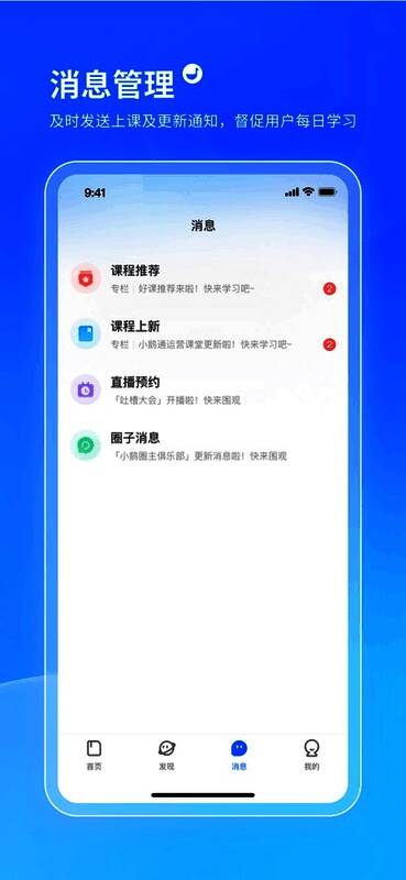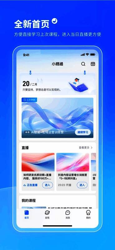 在最新发布的v5.17.1版本中,《小鹅通学员版》进行了多项优化升级。首页全新改版,找课更加高效快捷;音视频能力得到增强,支持连续播放功能;发现页也新增了更多课程推荐,方便用户发掘感兴趣的内容。