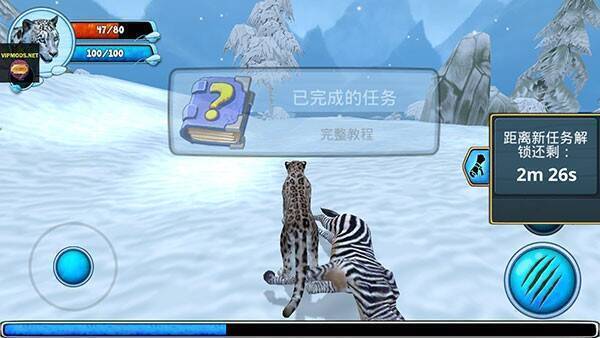 1、玩家操控雪豹在冰雪覆盖的山脉和森林中行动,寻觅猎物,达成生存目标。