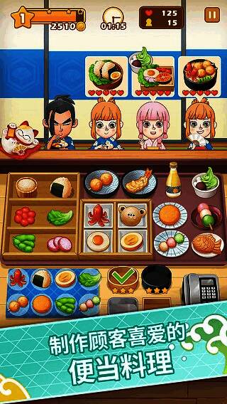 初次进入游戏时,选择关卡后点击“开店”按钮即可开始营业,每次开店消耗3点能量。根据顾客订单提示,点击查看所需材料,例如米饭、玉子、海苔等,确认后将食材依次拖入饭盒进行制作。制作过程自动进行,稍等片刻即可完成。完成后点击“交给顾客”,即可获得金币奖励。需要注意的是,每个关卡都有时间限制,必须在倒计时结束前完成所有订单并收取全部收入,才能顺利通关并解锁后续内容。