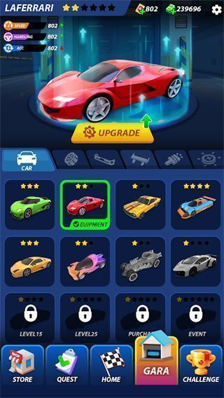 玩家可在游戏中解锁并驾驶多款风格迥异的赛车,涵盖街头跑车、超级跑车与专业竞赛车辆,每辆车均拥有独特的加速性能、抓地力与操控特性。更值得一提的是,游戏内置深度定制系统,允许玩家对赛车的引擎、悬挂、轮胎、外观涂装及贴纸进行个性化调整。通过比赛赢得金币后,不仅能购买新车,还可逐步打造专属的“梦想座驾”。
