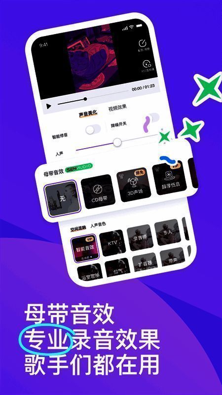 2. 更优质的K歌体验,专业的实验室级K歌音效,智能上下调音、一键声音校正,搭配超时尚音乐视频模板、特效和图像匹配,解决唱歌的各种小困扰。