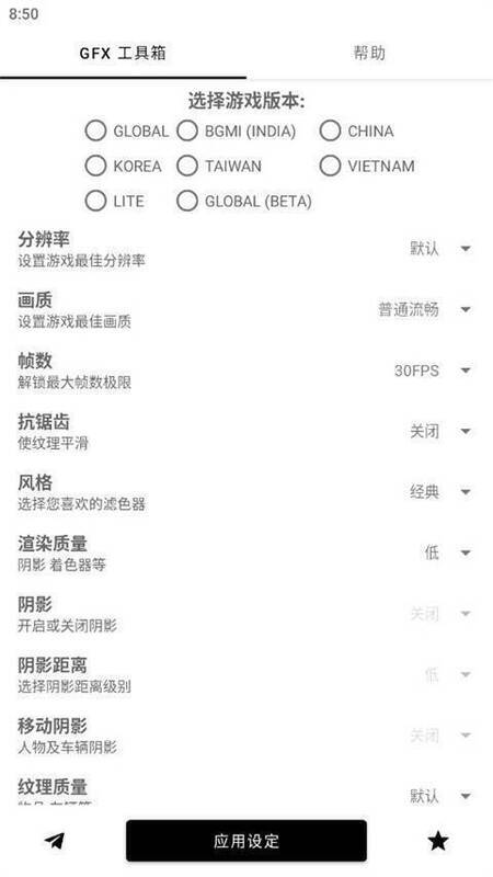 2、当工具箱主界面上方游戏版本栏消失,说明已选好游戏版本,设置好分辨率、画质、帧数等选项后点击【应用设定】保存设置。