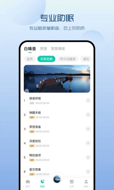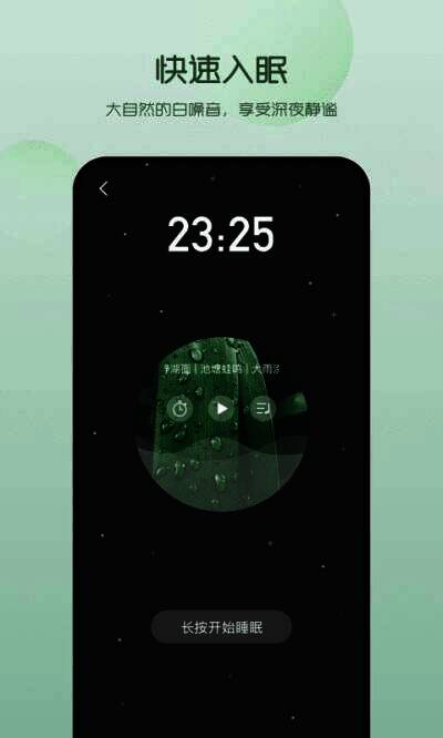 2. 智能助眠:APP内白噪音可智能辅助入睡,睡眠音乐丰富,可在线选播。
