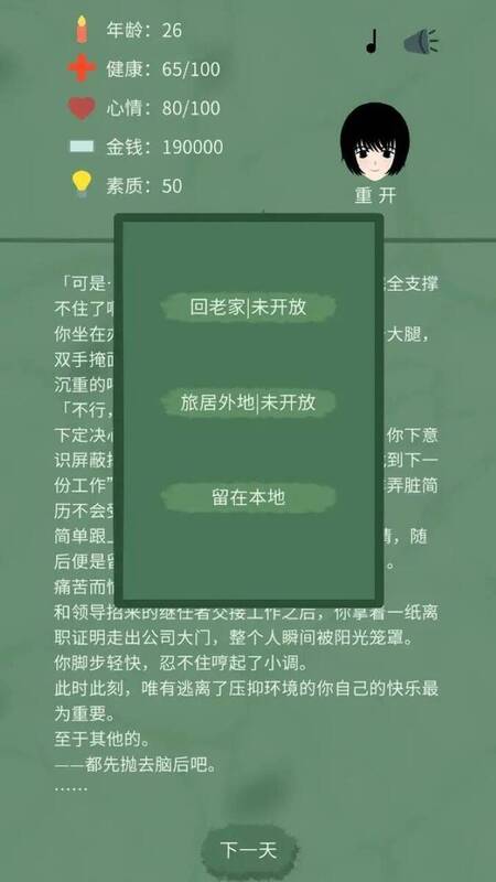 玩法简单直观,选择影响结果。能真实体验裸辞生活,感受决策连锁反应。快来开启梦想与现实的冒险,探索自己的人生道路。