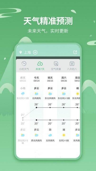 该软件有智能查询模式,可选择各时段天气、PM2.5、空气质量等信息,还能智能预警异常天气,带来全面服务。