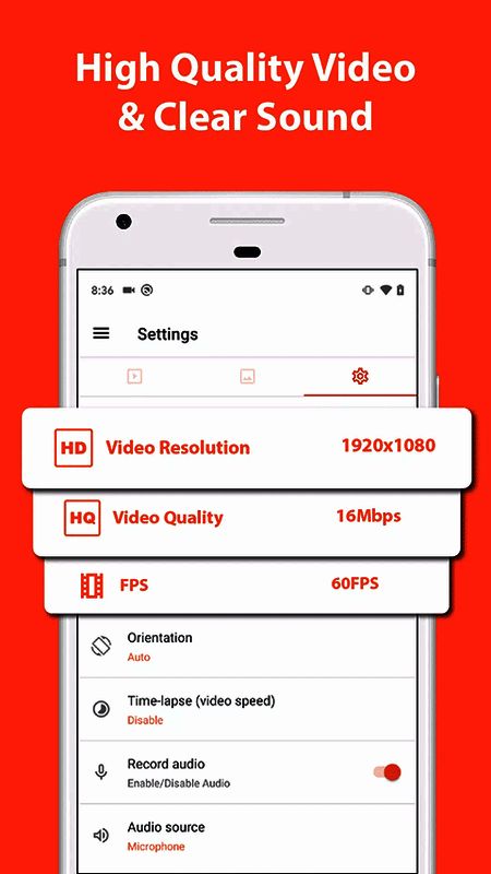 还能用设备的麦克风录制同步音频,在视频中显示屏幕触点,选择视频分辨率,设置开始倒计时,显示文本和徽标,将视频存储在SD卡上,设置延迟和缓慢运动。