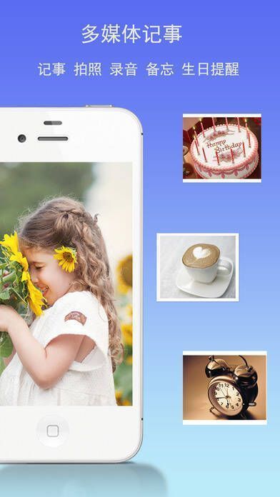 3、【高效记事】文字,录音,图片全方位支持记事,支持记事分类,工作,生活,购物清清楚楚,支持云备份,您的记事再也不会丢失了。支持重要备忘标星号,自动标在月历上,清楚醒目!
