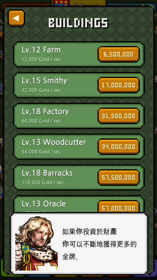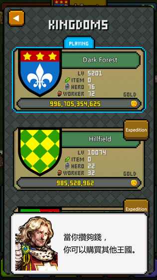 何必辛苦亲自赚钱,让赚钱变得更轻松!你只需借助手下的人民来盈利。狩猎怪物是英雄的职责,请提升英雄等级,让他们马不停蹄地工作。攒够钱后,去购置邻近的城堡,合理投资房地产,开启另一种财富之路。