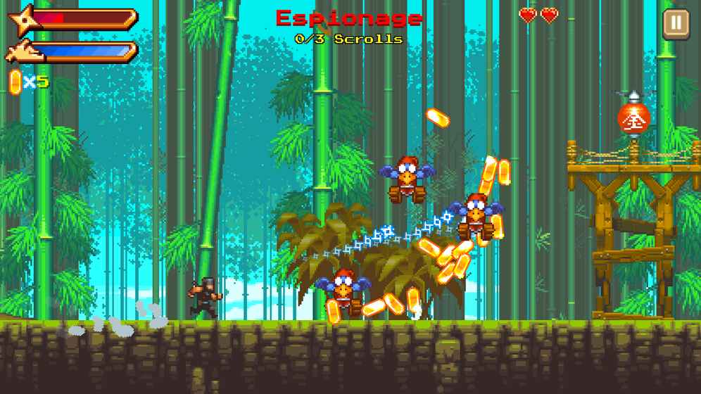 游戏仅设有三个操作:点击屏幕左侧实现跳跃,滑动左侧屏幕发动俯冲攻击,点击右侧屏幕发射忍者镖。俯冲攻击和忍者镖都有能量值限制,消耗后需等待一段时间才能恢复。玩家要运用这三个操作在场景中灵活穿梭,击败阻碍者、收集金币,同时提升自身各项属性,让游戏进程更顺畅。