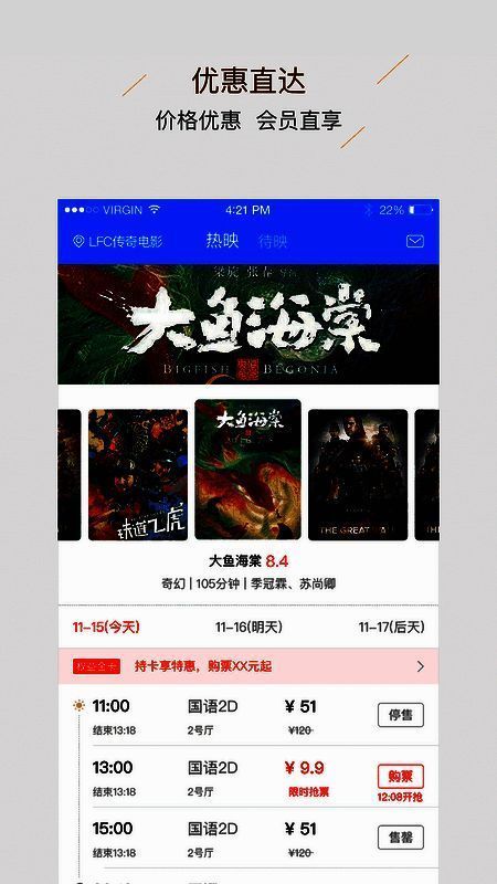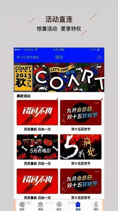 升级新手礼、低价票秒杀、签到赢好礼、限时免费看……LFC传奇电影APP活动不断;