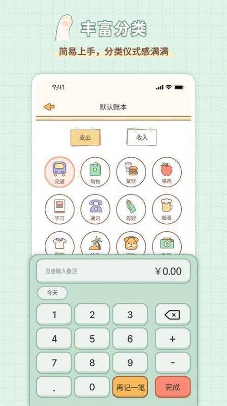 2、支持购物、交通、学习、房子等各类分类开支,想记就记。