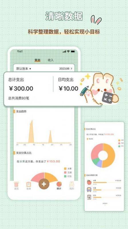 记账兔app是一款超级可爱的记账工具应用。它操作简单便捷,能助力用户记录生活里的每一笔支出,让每日收支消费情况清晰明了。软件充满仪式感,UI设计简洁,还有可爱的兔兔引导用户使用。它能科学整理数据,助用户轻松达成目标,各年龄段的用户都能轻松上手。