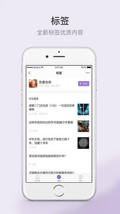 学术圈:能第一时间获取好友动态,还会依据你的喜好推荐感兴趣的内容;病例:可一手掌握行业最新病例,也能重温十年沉淀的经典病例;论坛:能随时随地浏览并参与社区讨论,还可定制阅读模式;消息:方便及时查看站内私信及论坛互动通知。