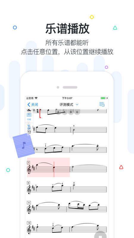 2、乐谱跟随:练琴时,应用会按演奏者节奏实时移动光标,自动翻滚乐谱。