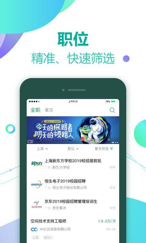 前程无忧旗下的应届生求职网,自 2005 年成立,专为大学应届毕业生及在校生打造求职招聘平台,全方位助力大学生求职,注重用户体验,帮助学生与社会对接,挖掘潜力以在职场取得更好发展。应届生求职手机版为毕业生量身定制求职平台,学生可依专业或喜好找到理想工作,为社会贡献力量。