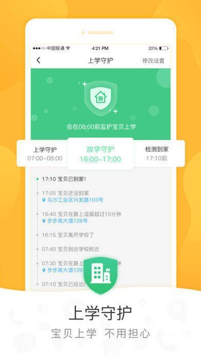 9、上学守护:借助定位功能,全面守护孩子上学和放学过程,主动告知家长孩子到校、离校时间,是否迟到、逗留、按时回家等情况。