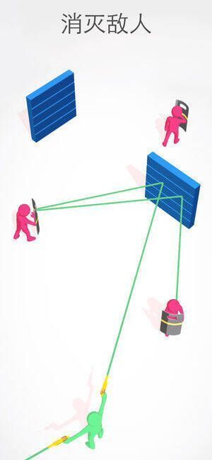 1、巧妙利用油桶、墙壁等障碍物,通过激光反射射击坏人并消灭他们。