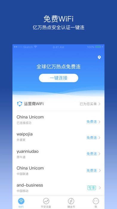 特点三:合法购买运营商大量热点,主要WiFi热点名如:ChinaNet、ChinaUnicom、and - Business、ap - pa033、bluesea - free、0wifi - free等,还有星巴克等商家热点等你来发现。