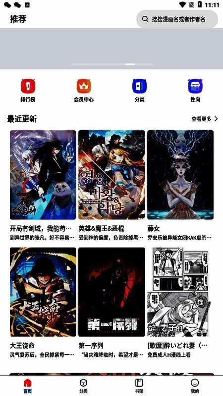 能从不同类别中自由挑选喜欢的漫画进行观看。